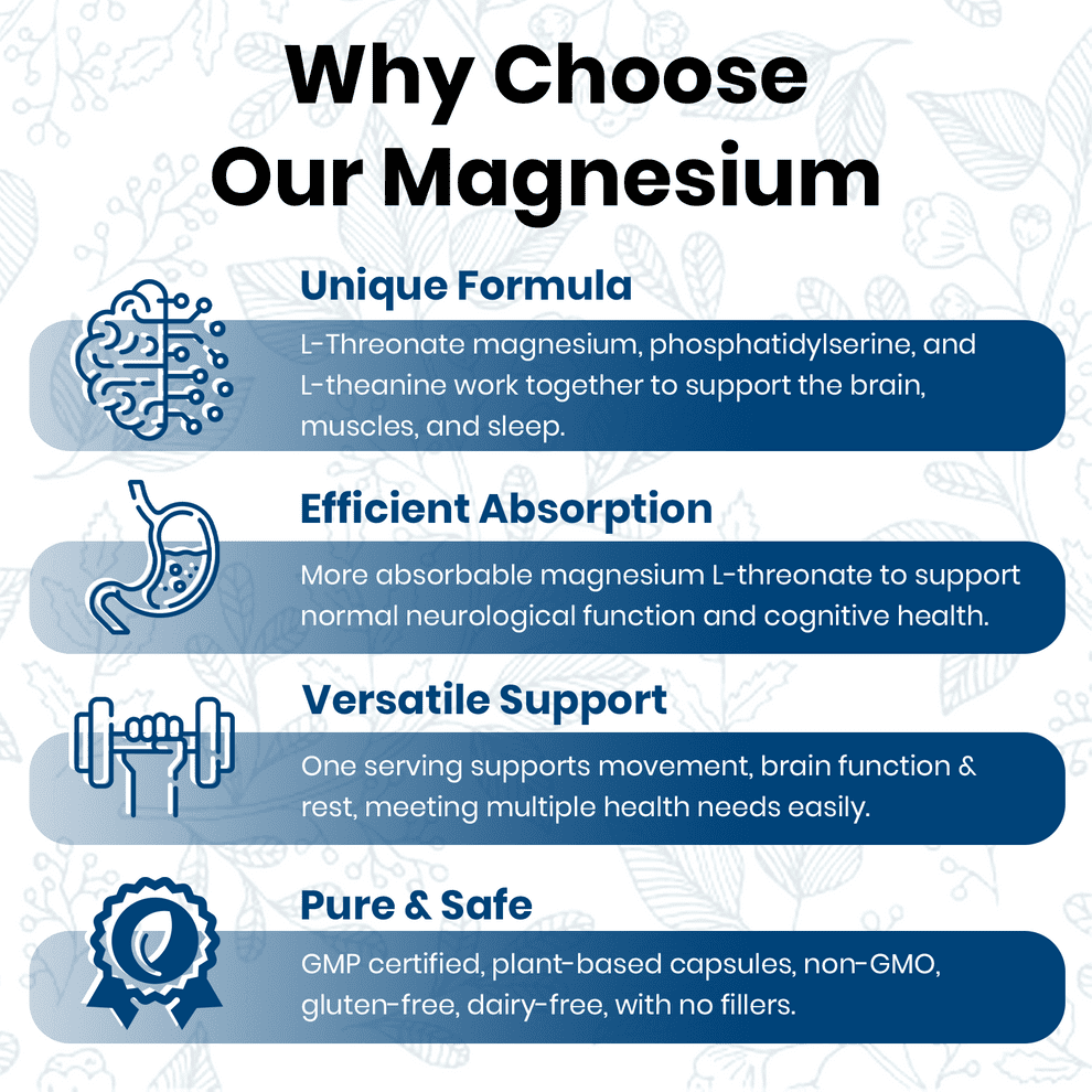 Enhanced Absorption, Gentle Digestion – Scientifically formulated to increase absorption of Magnesium L-Threonate by up to 80% compared to traditional magnesium salts, ensuring more minerals reach target tissues while minimizing gastrointestinal discomfort