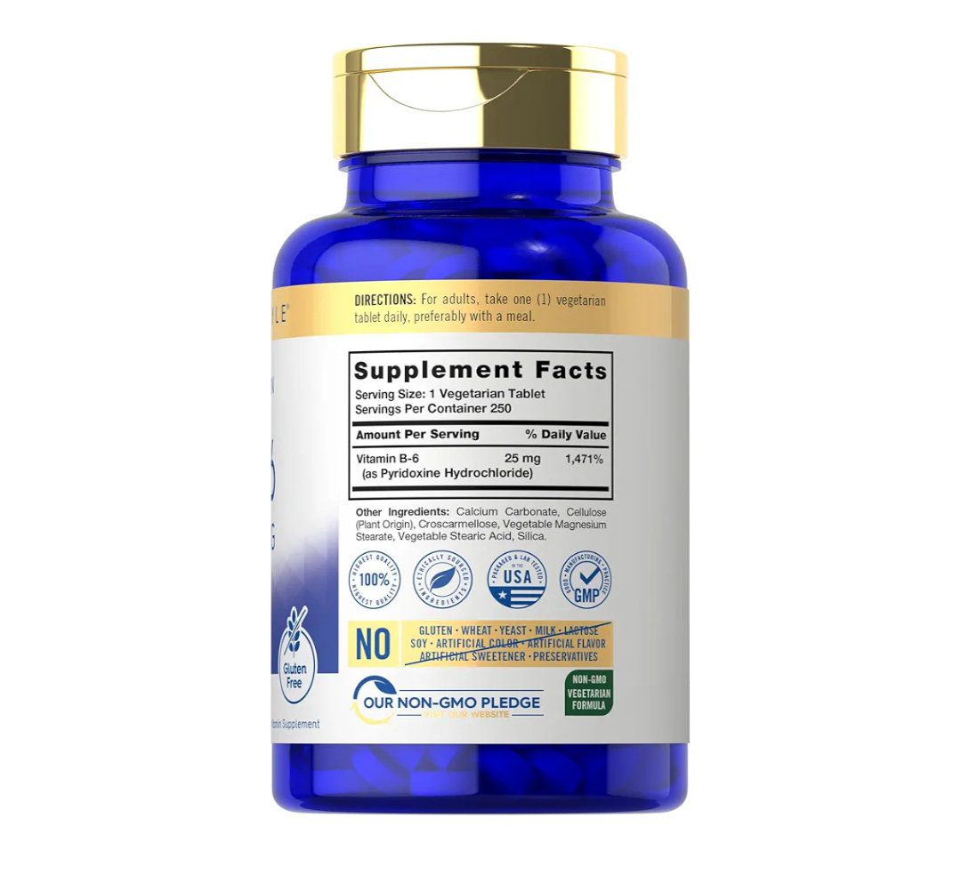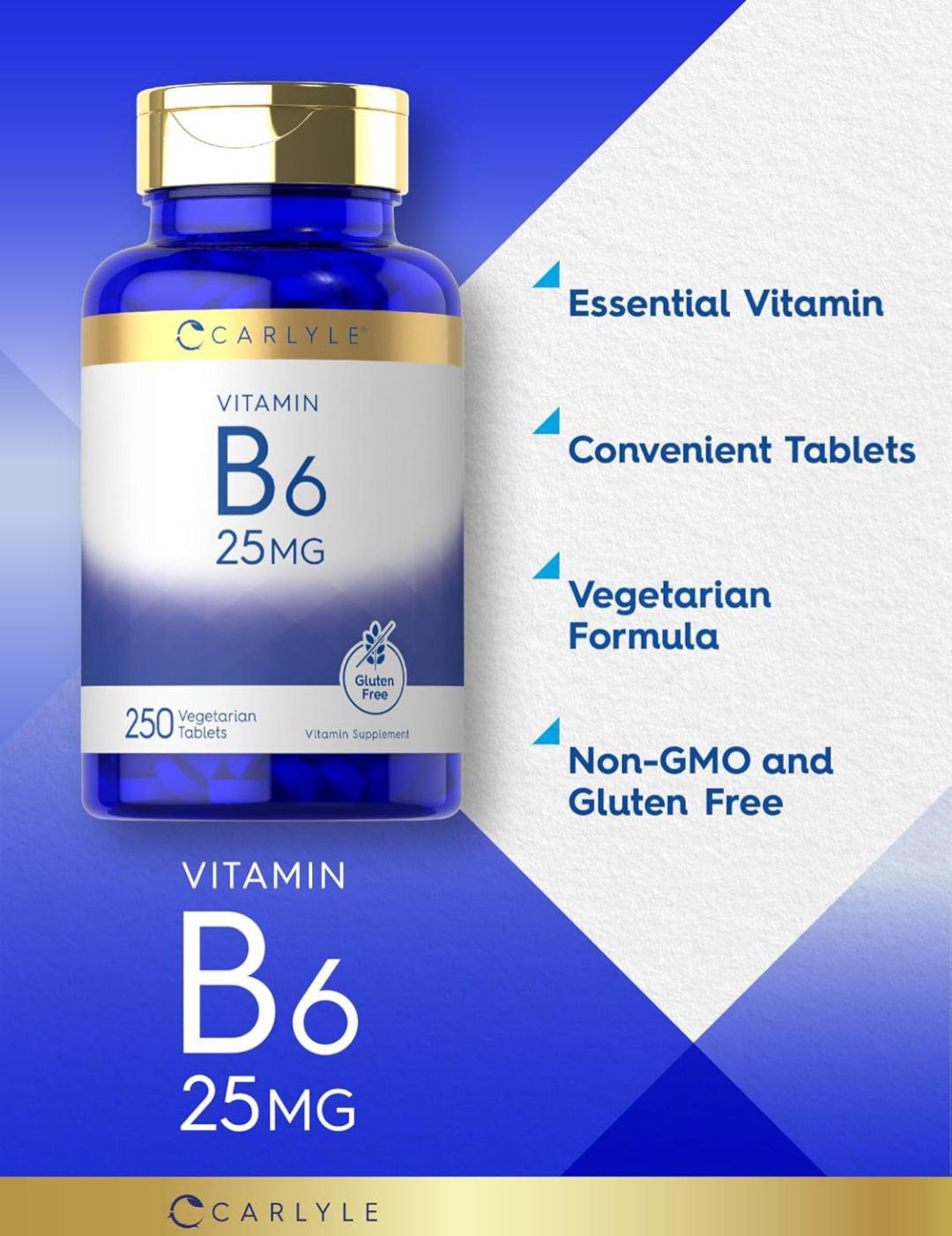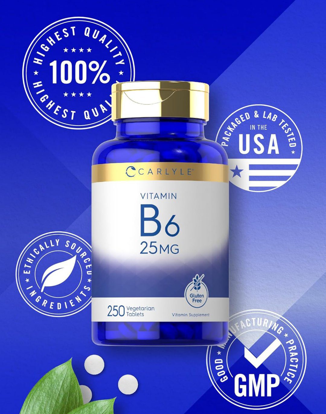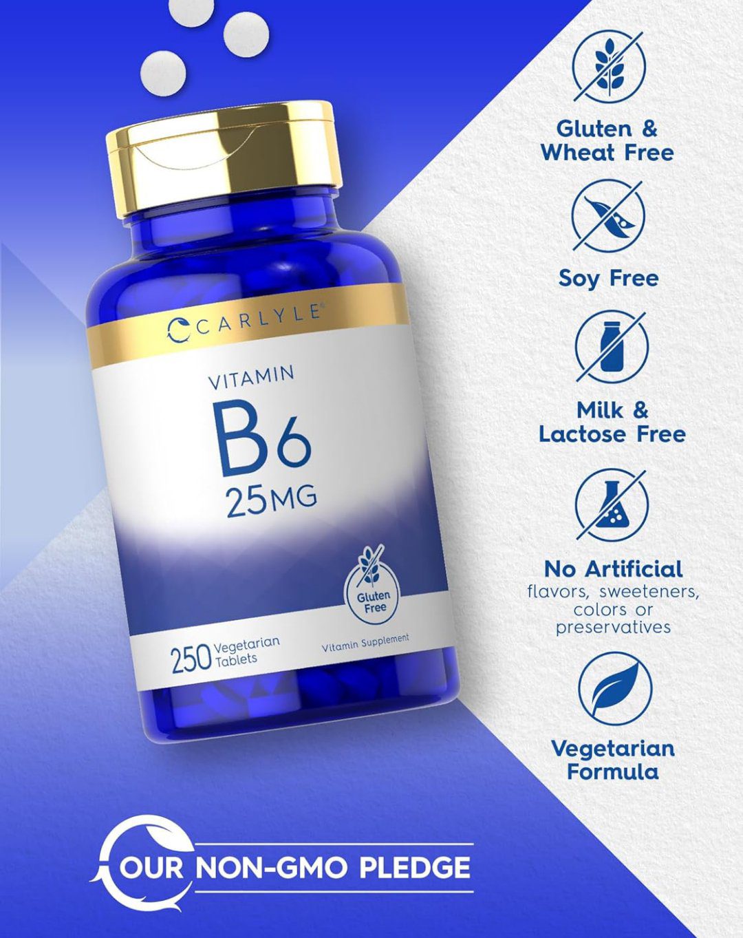 Carlyle Vitamin B6 | 25 mg | 250 Tablets | Supplement for Women and Men | as Pyridoxine Hydrochloride | Vegetarian, Non-GMO, and Gluten Free
