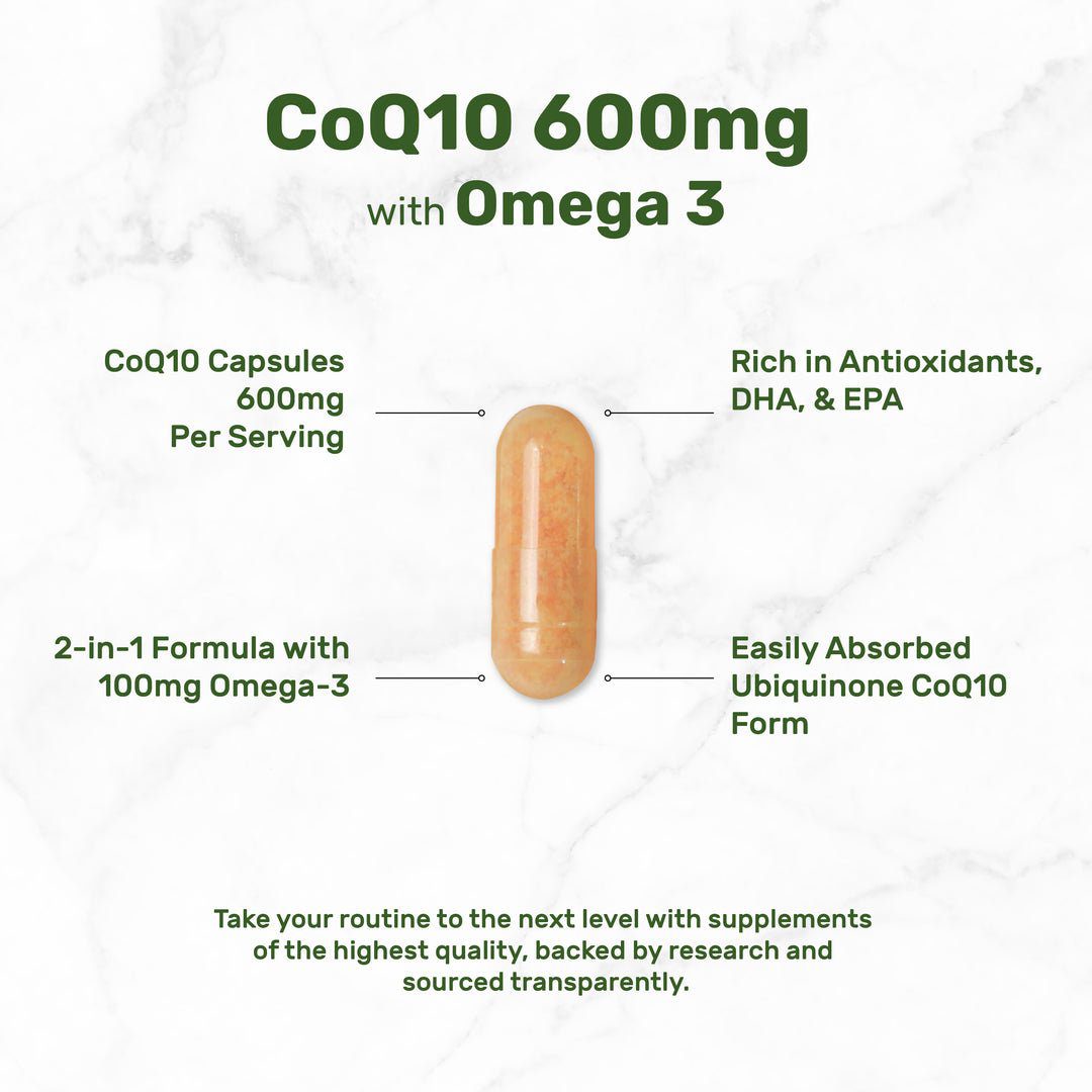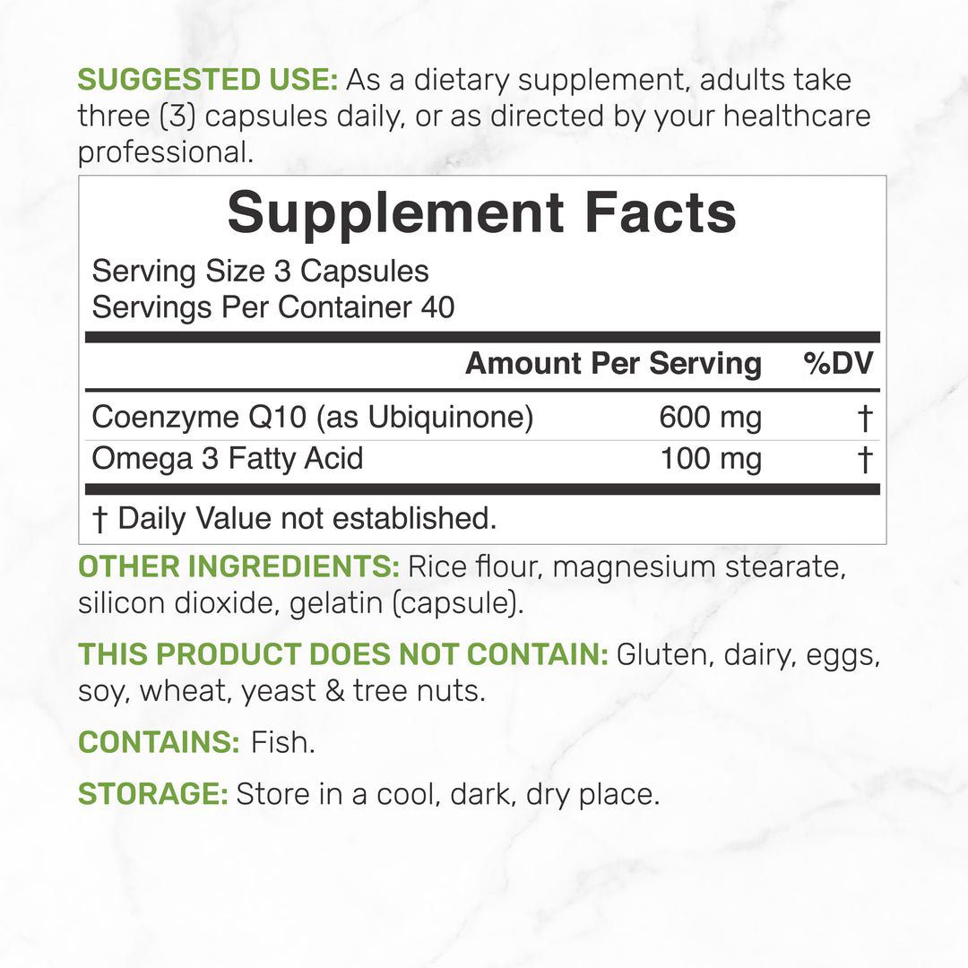 المكونات: يحتوي على 600 ملجم من الإنزيم المساعد Q10 و 100 ملجم من أحماض أوميجا 3 الدهنية لكل حصة.