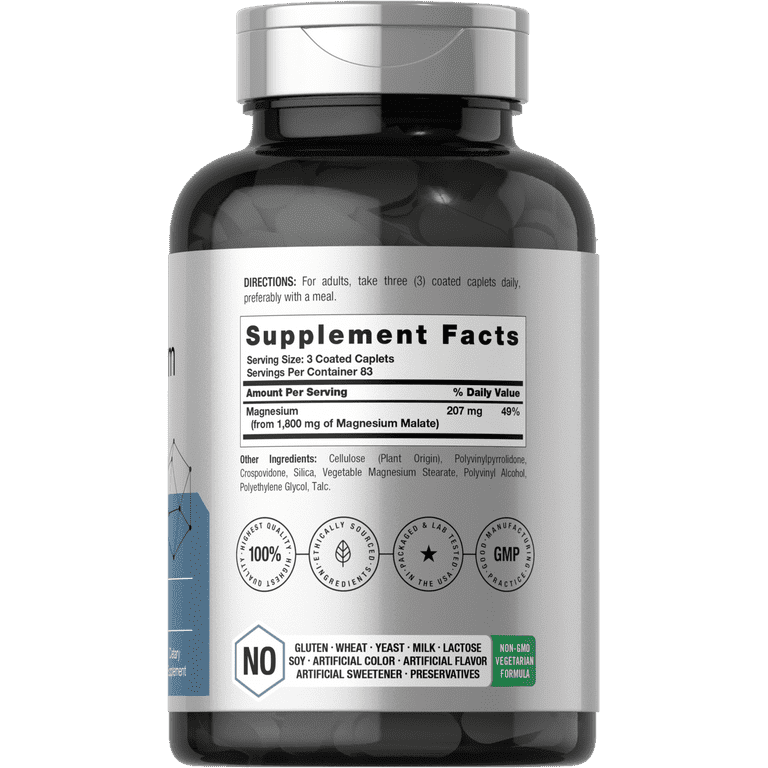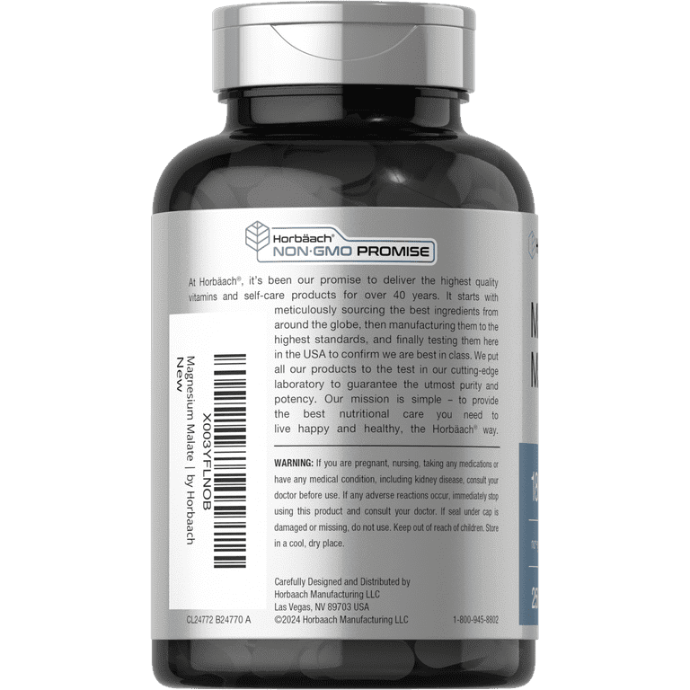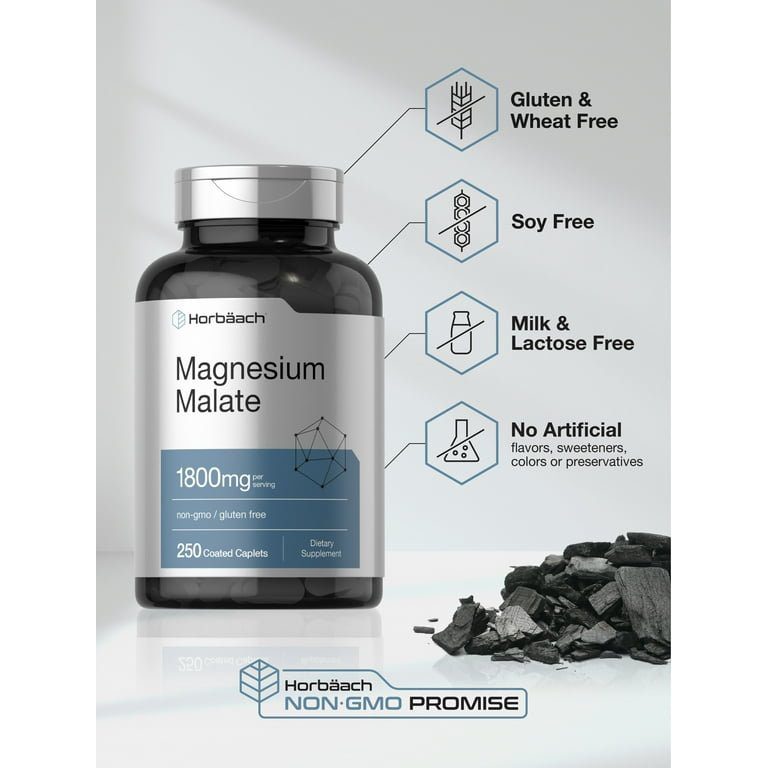 Horbaach Magnesium Malate 1800mg | 250 Coated Caplets | Vegetarian, Non-GMO, Gluten Free Supplement | by Horbaach