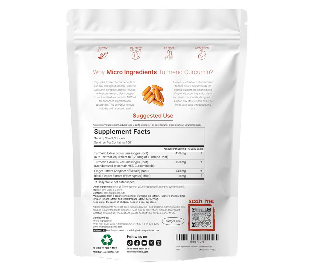micro ingredients, Turmeric Curcumin Supplement 3,000mg | 95% Curcuminoids | 300 Coconut MCT Oil Softgels with Turmeric, Ginger & Black Pepper Extracts | High Absorption | Healthy Joint Support for Men & Women | Non-GMO