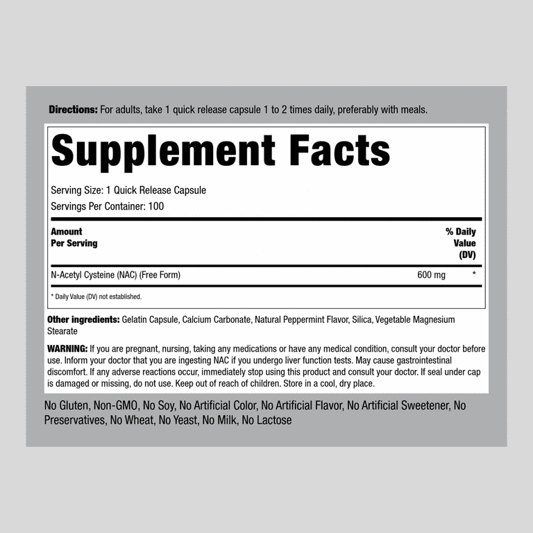 N-Acetyl Cysteine (NAC) 600 mg | 100 Coated Caplets for Men and Women | by Piping Rock