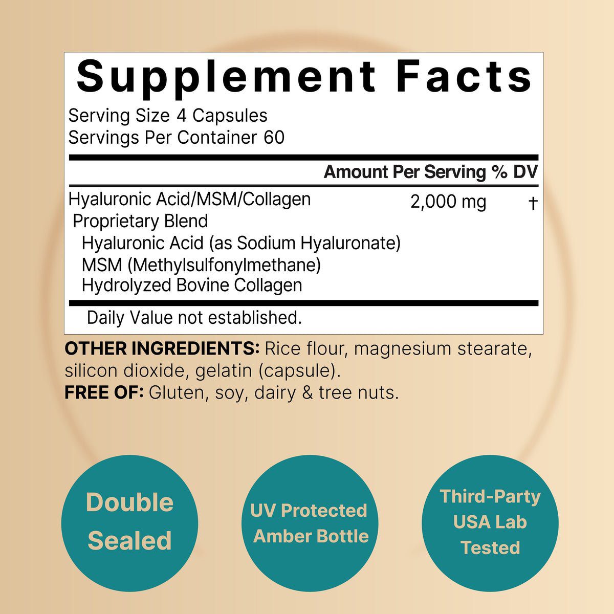 240* capsules per bottle. Up to a 2-month supply. 4 capsules per serving provides a 2,000mg proprietary blend of HA, MSM, and collagen from natural bovine.
