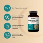 3-in-1 extra strength 95% pure hyaluronic acid capsules. Enhanced with MSM and hydrolyzed bovine collagen. Replenishes natural hyaluronic acid levels over time.
