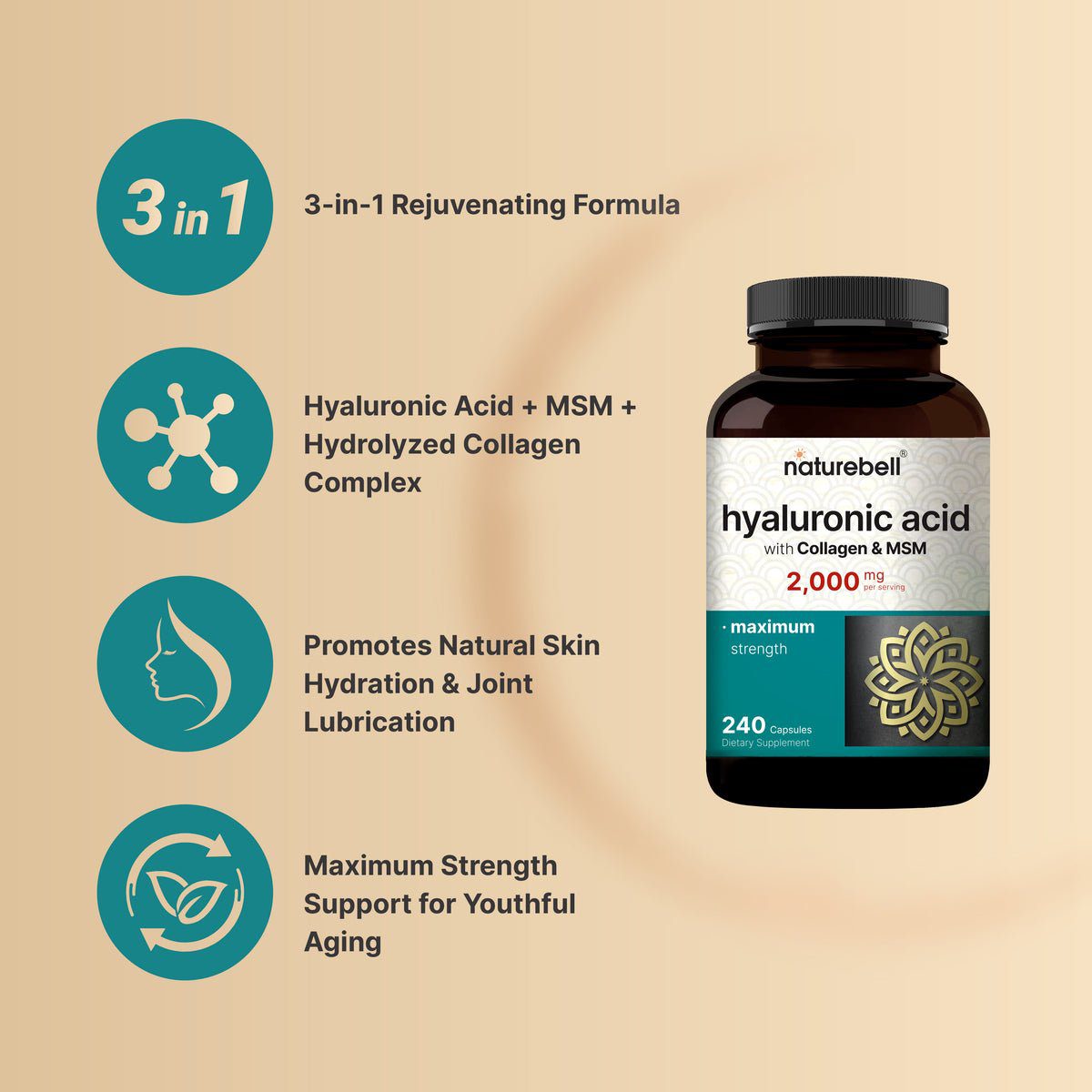 naturebell, Hyaluronic Acid with MSM & Collagen, 2000mg Per Serving, 240 Capsules
