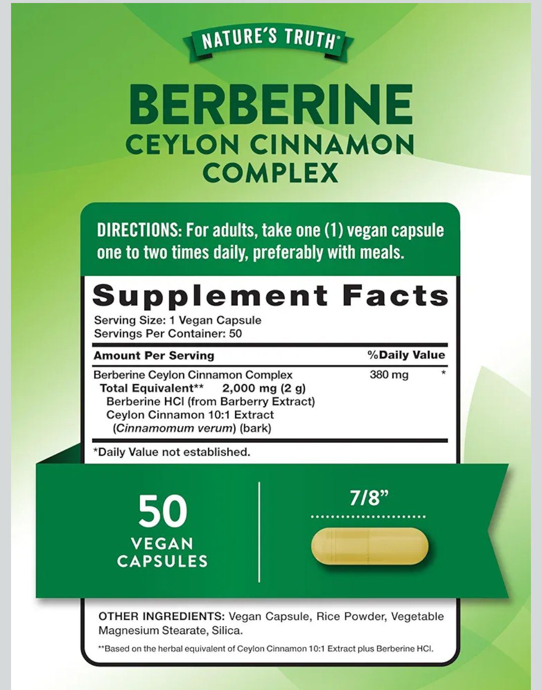Nature’s Truth Berberine with Ceylon Cinnamon Complex | 2,000mg | 50 Vegan Capsules | Vegan, Non-GMO, and Gluten Free Supplement