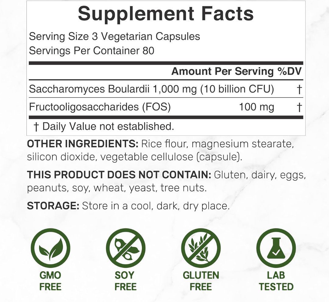 Saccharomyces Boulardii Probiotics + FOS Supplement, 10 Billion CFU, 240 Veggie Capsules – Probiotic & Prebiotic for Women & Men – Gut, Immune & Digestive Health Support – Non-GMO