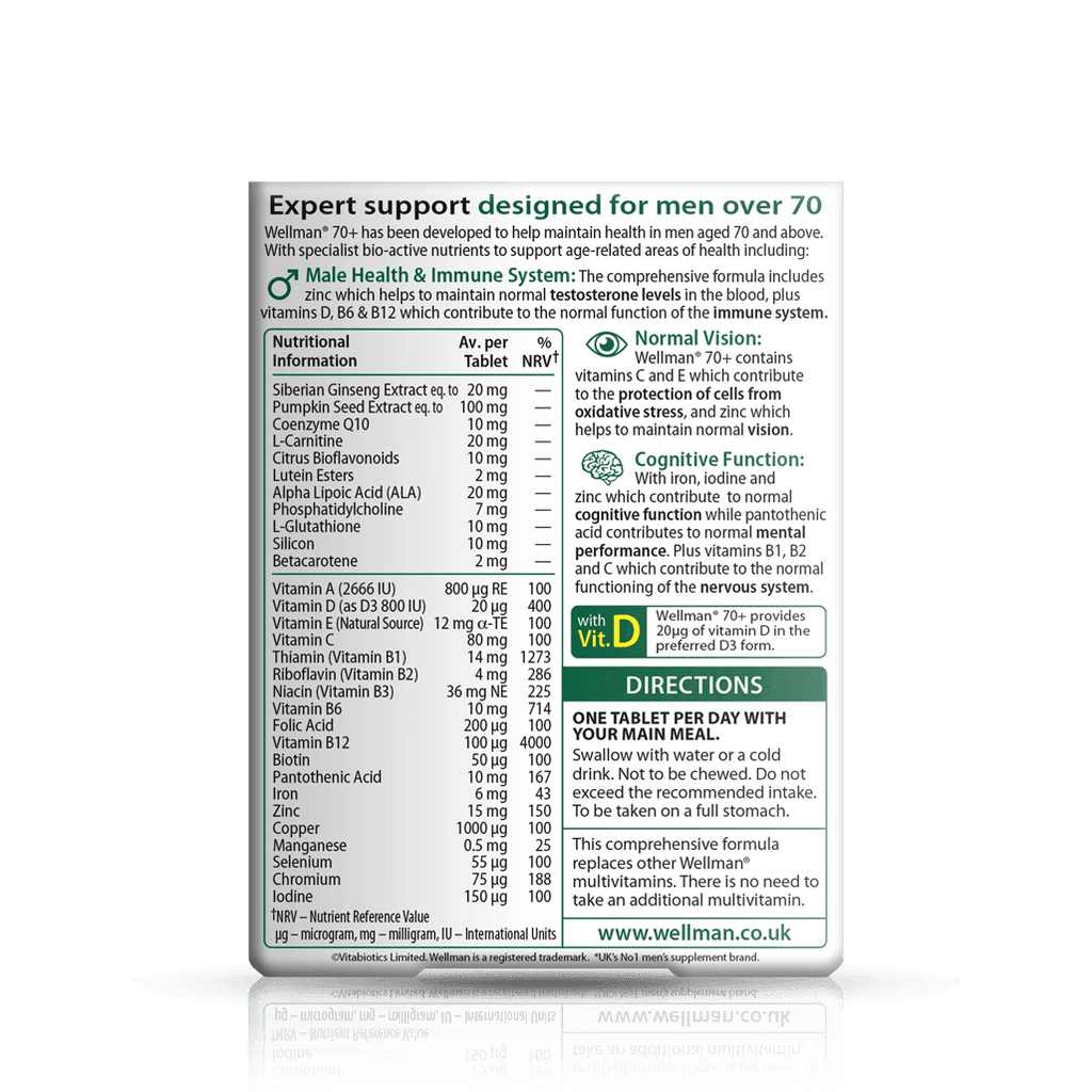 A carefully formulated supplement for men 70 and over, specially developed to support areas of health particularly relevant to men in the later stages of life, such as; heart, brain, energy, vision, immune and general health & vitality. From Wellman, the UK’s number 1 men’s supplement brand.